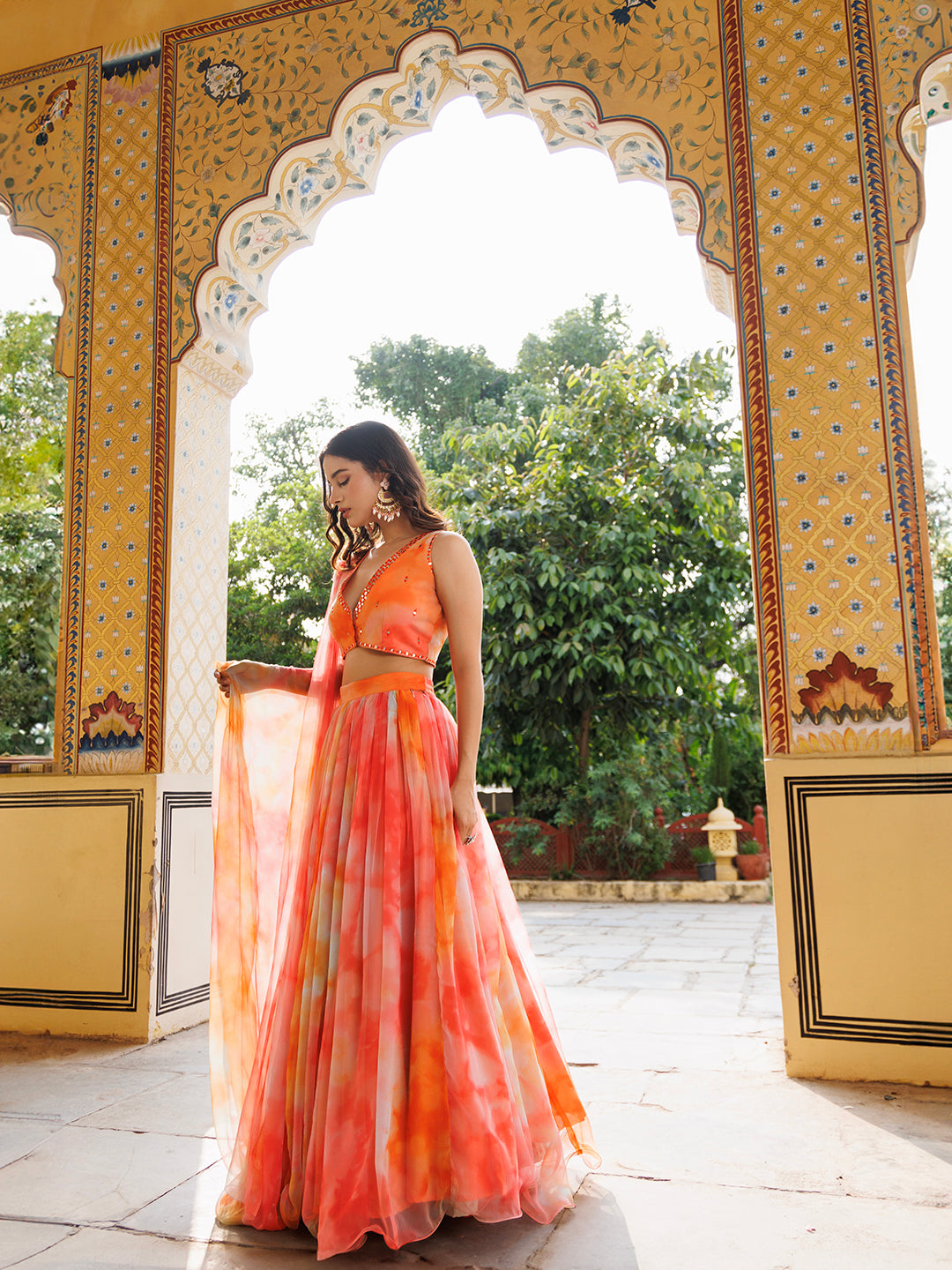 Illuminate your festive wardrobe with the Amberglow Orange Pink Chiffon Lehenga Set. This eye-catching orange lehenga set features vibrant floral prints on luxurious chiffon fabric, perfect for any celebration. The Blouse is designed with a stylish V-neck and sleeveless cut, offering a flattering and modern look. Complemented by a matching chiffon dupatta, this lehenga set provides an elegant and sophisticated touch for partywear and special occasions. Ideal for making a memorable impression, the Amberglow Lehenga Set combines bold color with intricate floral patterns, ensuring you stand out at every event. Elevate your festive attire with this stunning and graceful lehenga set.