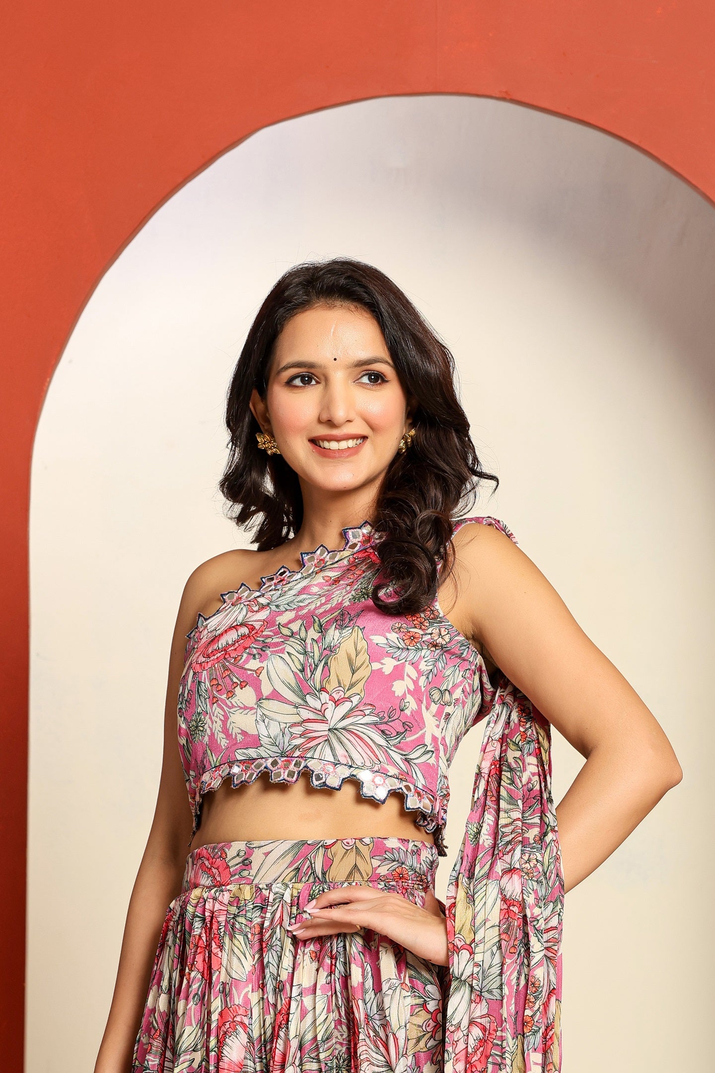 Turn heads in our pink floral one-shoulder lehenga set, a chic and contemporary twist to traditional ethnic wear. The cropped blouse features a stylish one-shoulder design with an attached flowy dupatta, making it both elegant and fuss-free. Paired with a voluminous lehenga in matching floral print, this outfit is perfect for modern celebrations.