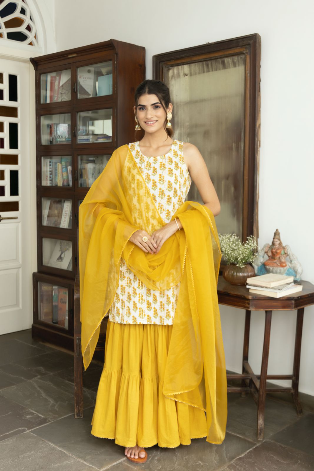 Unveil your feminine charm with the Yellow Suit Set by Ragavi. The set features a short printed yellow kurta crafted in soft cotton, perfectly paired with a matching sharara and dupatta. The delightful yellow hues give this ensemble a romantic edge, while the sharara adds a touch of playful elegance. Make a stylish statement from AM to PM in this captivating set.